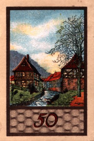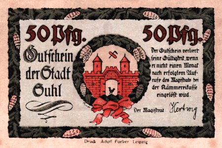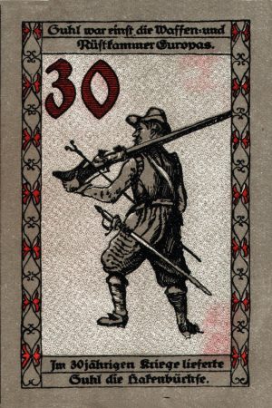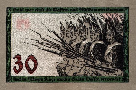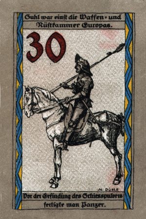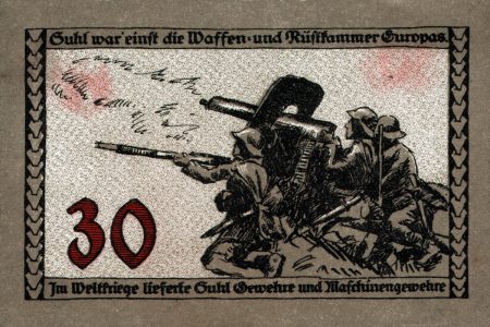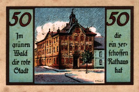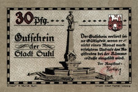 Der Magistrat der Stadt Suhl beschloss am 4. Januar 1917 in Suhl Kriegsnotgeld in Form von Münzen einzuführen. Eine der Ursachen war der Kleingeldmangel. Aufgrund des Metallmangels beschloss der Magistrat am 31. Oktober 1918 für eine Million Mark Papiergeld herauszugeben. Um kleinere Werte von Notgeld zu schaffen, wurde durch den Magistrat am 2. Juni 1921 eine Kommission gebildet, die sich mit der Herausgabe eines stadttypischen Notgeldes beschäftigen sollte. Die öffentliche Ausschreibung gewann der Rektor der kaufmännischen Berufschule und Direktor der Volkshochschule K. Mundt. Er schuf auch den Spruch, der nun am Suhler Rathaus zu lesen ist. Der Spruch fand Eingang in die Gestaltung des Anfang 1921 erschienen Notgeldscheines mit einem Wert von 50 Pfennig. Er erinnert an die Ereignisse während des Kapp-Putsches am 14./15. März 1920, als Suhl von von der Reichswehr besetzt wurde und Arbeiter, SPD, KPD und Parteilose das von der Reichswehr besetzt Rathaus und die Post stürmten.
